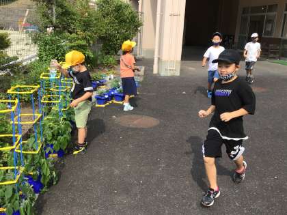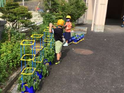 朝、昇降口でみんなを迎えるのですが、教室にランドセルを置くや否や、次々と水やりの子供たちが現れます。一年生の朝顔はつるがびよんと伸びてきたので、支柱が立てられました。ふと見ると、2年生の子が、あ!と言って、虫をすかさず退治しています。「ニジュウヤホシテントウは害虫だから。ナミテントウはいいてんとう虫だけどね。」と涼しい顔で言い残して去っていきました。生活科の授業で検索して害虫一覧を作ったみたいです。
