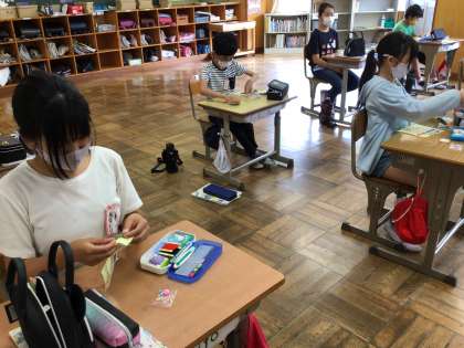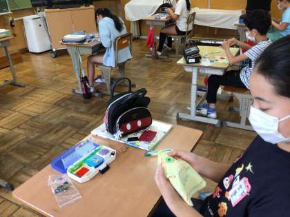 今日の家庭科では、ボタンの付け方を学びました。2つ穴のボタンです。玉結びをして、いざ、布地の裏から針を刺すのですが、なかなかボタンの穴に入りません。根気よく、少し刺しては確かめて、指に刺さらないように留めていきます。こつをつかめば簡単です。どの子も黙々とやりきり、完成して初めて声が出ました。これからは、ボタンが取れたら自分で直せますね。技を一つ身につけました。