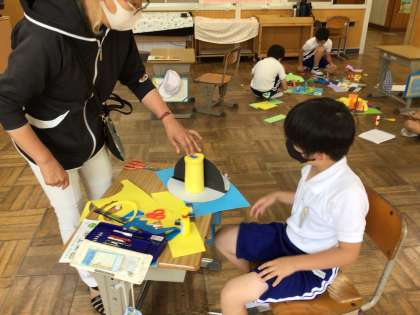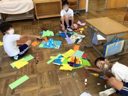 今日の図工は自分のアイデアが存分に生かせる家作り。回転していろいろな部屋が楽しめます。これはイルカ、これは秋の部屋、とうれしそうに教えてくれました。でも、自分の家よりも、友達の家のよさを紹介する3年生のみんなでした。仲良しですね。