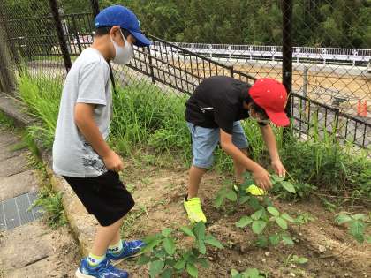 3年生がカメラを手に写真を撮っています。大豆の白い花が咲いたからだそうです。写りが悪かったので、再度撮影に行くと、見つけてしまいました!!カメムシです。最初は、ひええと言って、しきりに嫌がっている2人でしたが、調べ学習で見つけたカメムシの退治の仕方を思い出したようで、茎を揺さぶって水の中に入れ、15匹以上退治しました。臭いよと言いながら、最後は泡だらけにして手を洗いました。