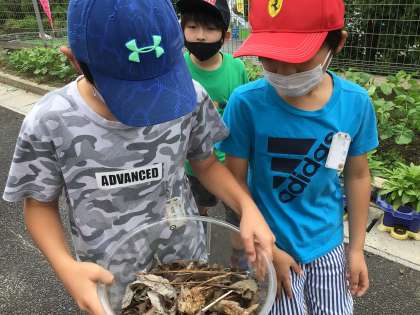 校長室に訪ねてきた子たちがいます。階段のところにクワガタのメスがいたそうです。早速、水槽の中にすみかを作り始めました。枝を折って、枯葉を入れて、土がいると言って、畑の方に歩き出しました。昨日出会ったカメムシいないといいなあと言いながら。