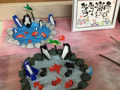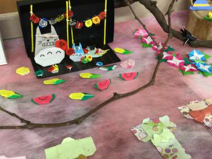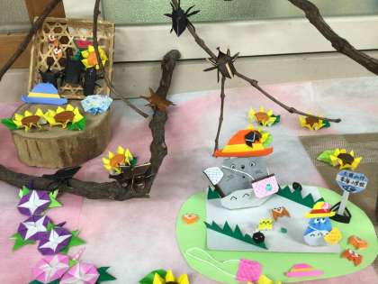 正面玄関の季節の折り紙作品コーナーが新しくなりました。もう気持ちは梅雨明け。夏です。公務手さん、いつもありがとうございます。子供たちはもう気付いているかな。