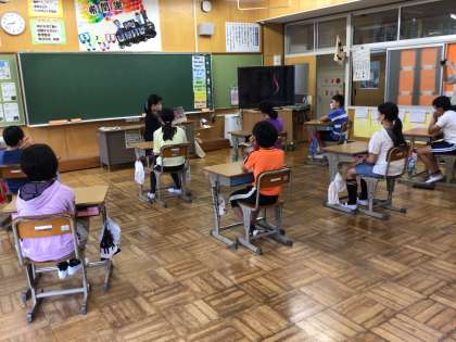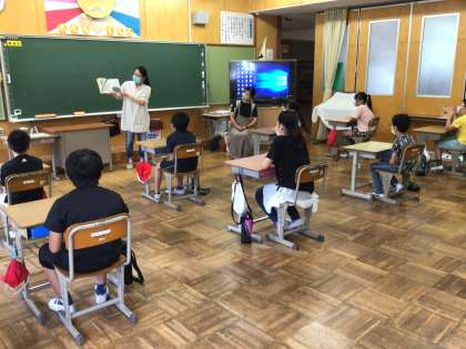 456年生の教室の様子です。食い入るように見入っていますね。早くコロナがおさまって、近くでお話が聞けるようになるといいね。