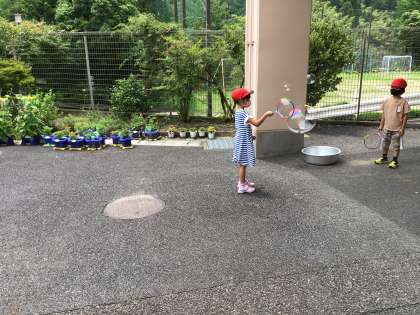 大きなシャボン玉をいろいろ工夫して、作りました。