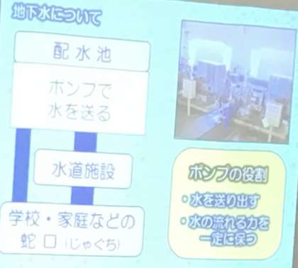 今日は、豊田市水道サービス協会から2名の講師の先生が来てくださいました。豊田市には、約360箇所の水道施設がありますが、24時間体制で勤務している場所は、一箇所だけだそうです。そのかわり、毎日点検に出かけたり、モニターで監視したりしているそうです。