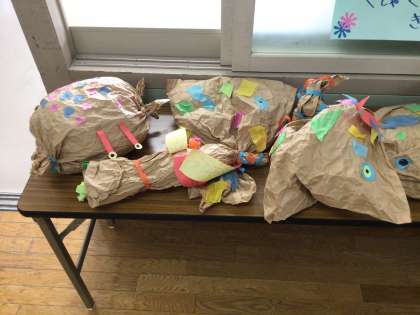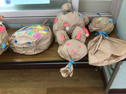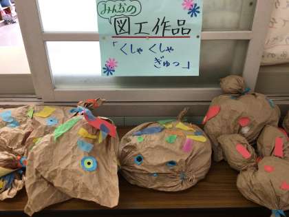 図工で、紙袋を使って、「くしゃくしゃぎゅっ」という作品を作りました。