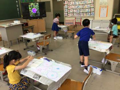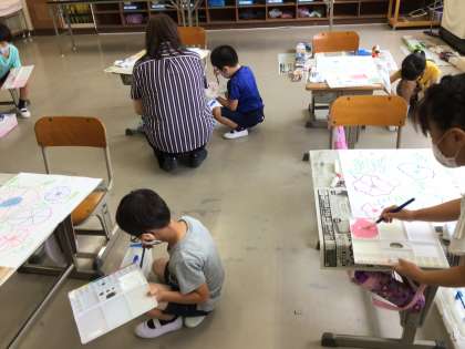 教室では、担任の先生が、「ジュースみたいになったかな」と声をかけながら、すうっと絵の具が伸びるように一人一人に支援をしていました。カルピスみたいとか、いちごミルクみたいとうれしそうに描く子供たちでした。