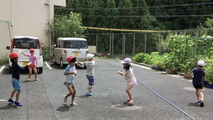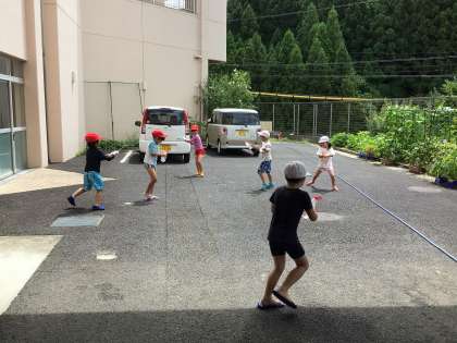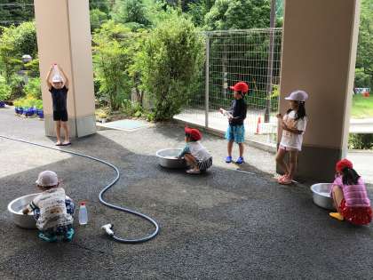 今日も外遊びができない熱中症警戒マークが昇降口に掲示されました。養護教諭の先生が1時間おきに測定してくれています。今年はプールもなかったので、担任の先生が、生活科の学習と合わせて、水遊びを計画しました。みんなうれしそう。少しケチャップの匂いがすると言いながら、3つの穴や星形、三角の穴にも注目していました。チームを作ろうか、何人チームにしようかと、じゃんけんまでしましたが、結局、それぞれでかけあっこしました。その様子をじっと見守る担任の先生。子供たちの自主性を育む姿でした。どの子も水着を着て、大はしゃぎの1時間。少し涼めましたね。
