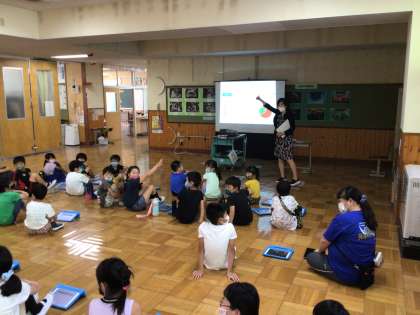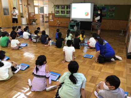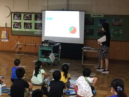 アンケートの入力をして、結果を映しました。みんなの意見が反映されて、グラフに表示されました。