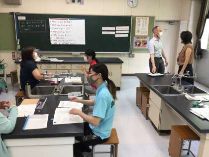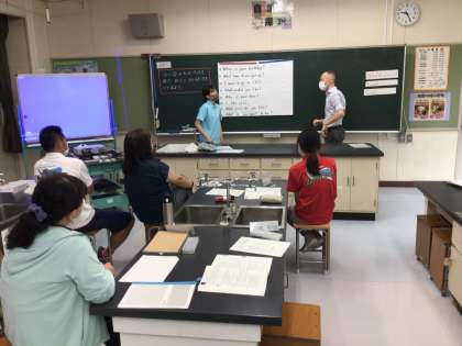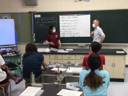 現職教育でスモールトークのビデオを見た後、ALTの先生とキーセンテンスをもとに、スモールトークを行いました。