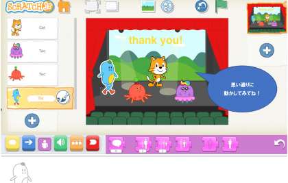 授業では、「発表会に出る友だちをおうえんしよう」というお題で、お話をイメージしながらプログラミングしたそうです。どんどん論理的な思考力をつけていけそうです。一人一台タブレットの中に入っています。いろんなお話を作ってみると楽しく学べそうです。
