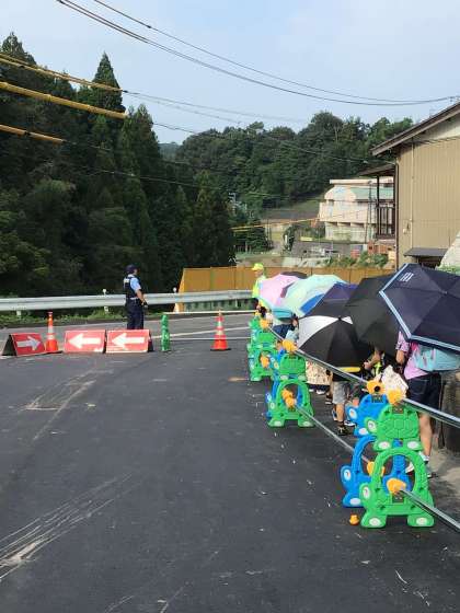 今日から9月。子供たちはマスクを外しての傘さし登校。朝から蒸し暑かったのですが、頑張って登校できました。明日から幸海地区の通学路の歩道が数メートル移動しますが、今日は予行練習で歩いてみました。見守り隊の佐藤さんや工事を請け負う藤本建設の方、王滝駐在署長の林さんが通学の様子を温かく見守ってくださいました。子供たちも班長を先頭にまっすぐに並んで安全に登校することができました。工事の詳細は、回覧板でもご覧いただけるようです。見守り隊の皆様に感謝です。