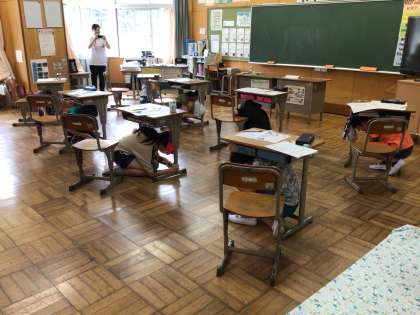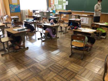 今日は以前予告したように、シェイクアウト訓練を正午に実施しました。地震の揺れから身を守るための訓練で、姿勢を低く、頭を守り、じっとするという3つの動きを身につけるためのものです。職員室からの、「訓練訓練〜」の放送で、素早く机の下に潜り込み、しっかり机の脚をつかむこともできました。いわゆるダンゴムシスタイルです。教室には、ダンゴムシスタイルのモデルが常時掲示してあります。今日の訓練をきっかけに、どこでも、一人でも、できるように、定期的に実施していきます。