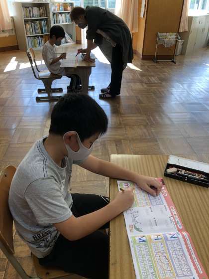 3年生は、朝の学習タイムでローマ字の練習をしました。小さいゃがつく時は、最後は必ずaになるきまりをつかむことができました。