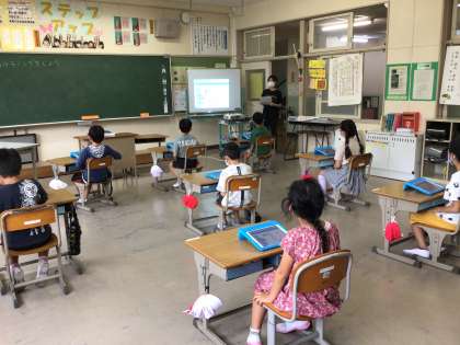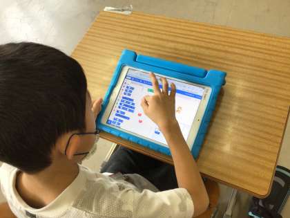 2年生の教室では、プログラミング学習の最中でした。イメージしたリズム打ちをタンとウンで作って音にするプログラムです。出来上がった作品を何度も入れ替えながら楽しむ子供達でした。