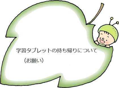 依然として新型コロナウイルス感染拡大が予断を許さない状況です。本日より、学習タブレットを毎日持ち帰ります。ご家庭で充電し、毎日学校に持たせていただくようお願いします。これまでの紙による「健康観察カード」からタブレットによる「SKYMENUけんこうかんさつ」に移行します。児童の体調を把握するための大切な情報です。今後もカード同様に毎日の健康チェック・提出をお願いします。