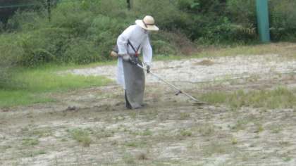 夏休みの間に運動場の草がとてもたくさん増えました。運動場で走ると草につまづいてあぶないので、公務手の方が草を刈ってくださっています。