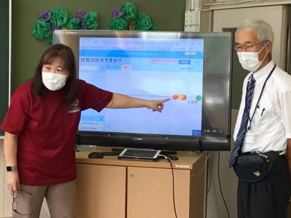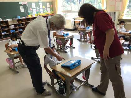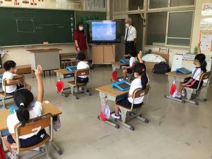 1年生は、生活科の授業で、発表ノートを使って、昆虫の資料を作りました。さらに、先生からの質問!「給食は好きですか?」という答えをポジショニングの機能を使って大好きから大嫌いまでの間に点を移動させました。その場所にした理由も伝えることができて、ICT活用のよさを感じました。