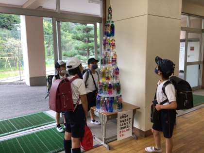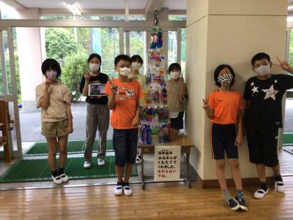 6年生がみんなの作成したペットボトルアートを組み立ててくれました。学校のリーダーとして、何かできないかと考え、申し出てくれたものです。放課ごとに集まって、両面テープを貼ったり、配置したりして、ついに本日、堂々の完成です。低学年の子達が下校前に見つけて、うわあ、すごいね、と口々に歓声をあげていました。自分の作品の場所も気になるようでした。