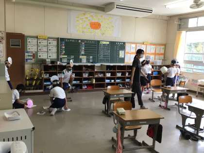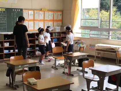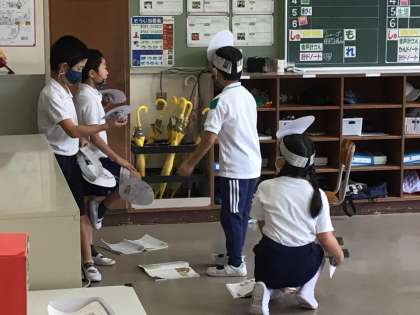 2年生の教室に行くと、それぞれ自分の作ったお面をかぶって、音読発表会の練習をしていました。今回は、自分達で話し合いながら、練習をしているそうです。2つのグループに分かれているので、お互いの様子を見ながら「早く私達もやろうよ」と声をかけていました。どう力を合わせたらよいのか学んでいますね。