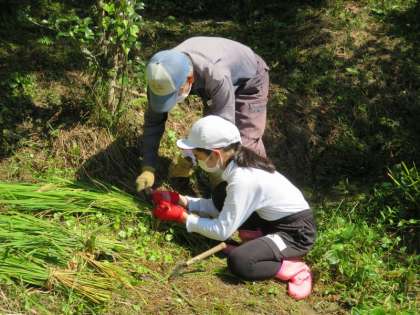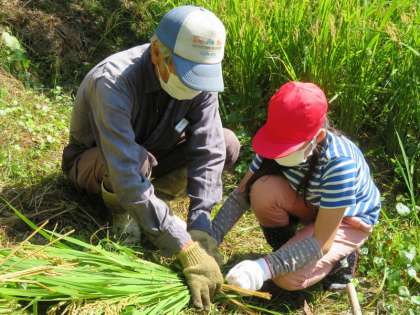 5年生は総合的な学習で、稲刈りを行いました。学校の田んぼに子供たちが植えた苗です。腰に力が入らない様子の子供達でしたが、地域講師の藤嶋さん、清水さんのご指導の下、何とか鎌で刈ることができました。
