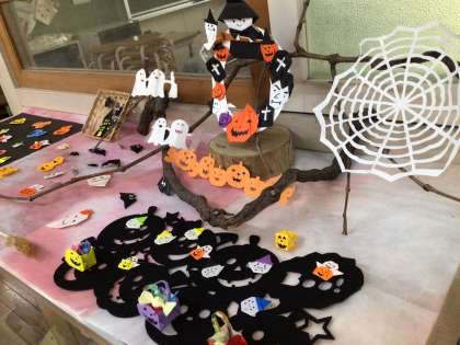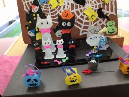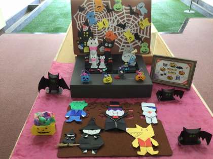今朝は、玄関のコーナーがハロウィン一色になっていました。見ているだけでわくわくします。廊下を通る子供達もこれがいいなあと指差して楽しんでいました。額縁の文字もあっという間に一新。公務手さんと心の相談員さんのあうんの呼吸が素晴らしいです。
