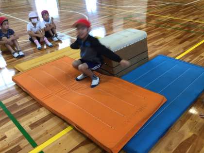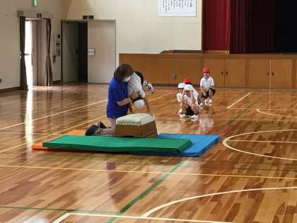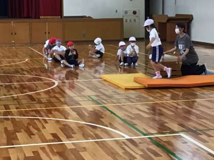 体育館でマット運動を行いました。こつは手をつく位置。見る位置です。おへそを見ながらぐるんと回りました。うまく回転している子のこつをどんどん見つけたいですね。学習タブレットの、動作を映し、自分自身で確認する機能も、今後使っていきます。