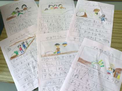 4時間目に招待状を作っていた1年生。ぎりぎりアウトで間に合いませんでしたが、出来上がった招待状はとてもていねいに仕上げてありました。心がこもっていますね。水曜日がとても楽しみです。