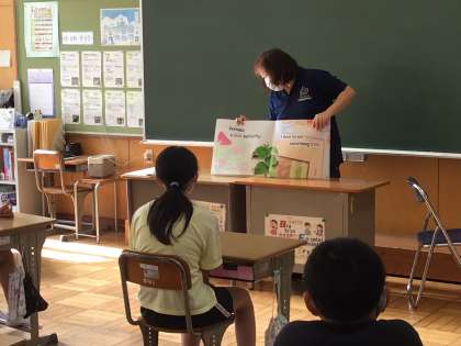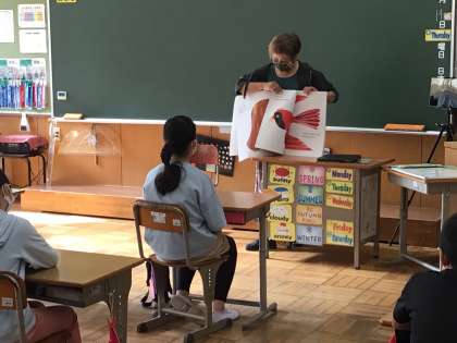 担任の先生が、各学級を順番に回って、英語で絵本を読んでいます。