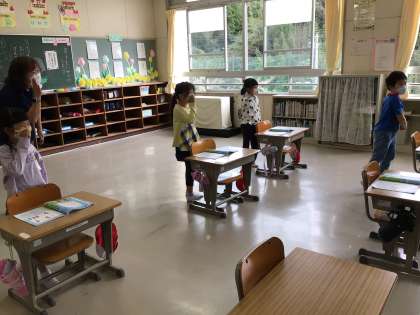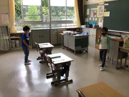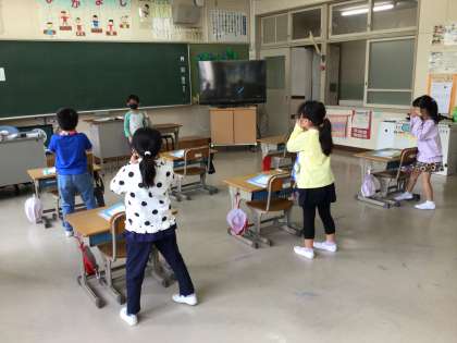 やまびこごっこを楽しんでいた1年生。やまびこのかけ声を自由に替えて、みんなでまねっこしていました。替え歌には、火山が噴火して、と理由も伝えてくれました。