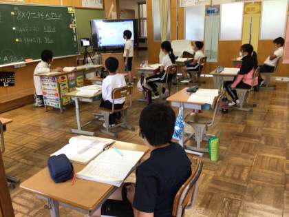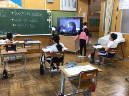 5年生の子供達は、面積の求め方を復習していました。四角形の向きが変わると、底辺や高さが一瞬分からなくなります。垂直を見つけ出して、長さを測り、底辺かける高さの公式で求めることができました。前に出て、図を指差しながら、説明もできましたね。
