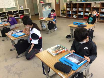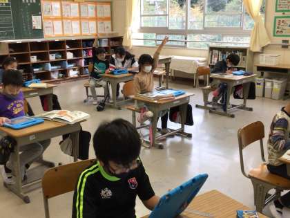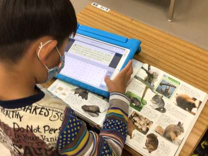 中央図書館の職員の方に教えていただいた、調べ学習のしかた。今日は、ビーバーの大工事をもとにした、クイズを作りました。タブレット上に、いくつも作っていく子供達。必要な情報を図鑑から見つけ出すことも、スムーズになりました。クイズ大会が楽しみです。