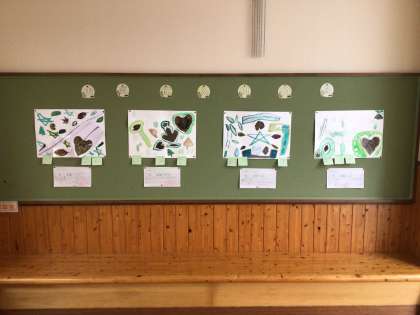 緑の絵を描きました。「お気に入りの緑」というテーマで、落ち葉などを使って、楽しく作りました。