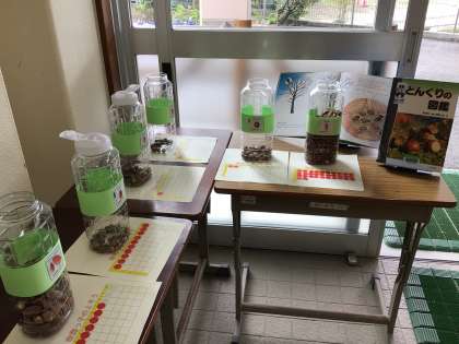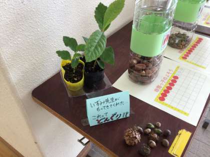 いずみ先生がお家から持ってきてくれた、苗。これは、ドングリなのでしょうか?ドングリなら、どの種類でしょうか?ちなみに、いずみ先生は、家の前に埋めてもいないのに、生えてきていたと言ってみえました。さて、だれのしわざでしょうか?ヒントは、図書の中にあるかも。