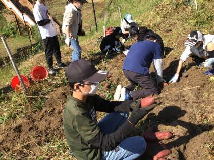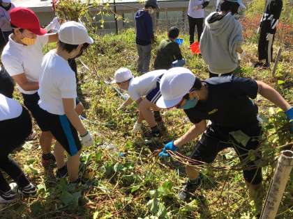 4、5、6年生の芋畑は、つるが生い茂っていました。高学年の子供達は持ち前のパワーで、手強いつるを次々と引っこ抜きました。マルチを片付けたら、やっと芋掘りスタートです。芋の土を丁寧に振り落とす6年生の姿。さすが、6年目。段取りがよく分かっています。