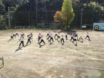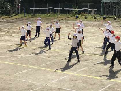 運動場で運動会で披露する「ソーラン節」を練習しました。繰り返し練習して、本番に全力演技ができるようがんばります。