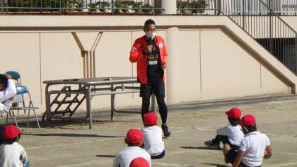 元オリンピック選手(夏冬出場)の青戸慎司選手をお迎えして、走り方教室が行われました。5つの走り方のコツを教えていただき、実際に練習しました。すごく速く走れるようになりました。