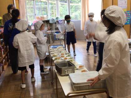 コロナの感染拡大防止のために、ずっと給食の配膳は担任が行ってきましたが、レベル1の対応に伴い、当番活動を再開しました。当番は、事前に検温、体調確認、消毒を行います。 3、4年生にとっては、久しぶりの活動です。5、6年生の教室に向かうとすでに配膳が終わっていました。さすがです。