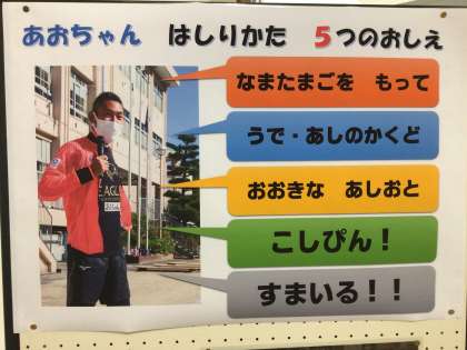 昇降口に、走り方教室の青戸先生から教えていただいた、速く走るためのこつを掲示しました。みんな意識できるといいね。