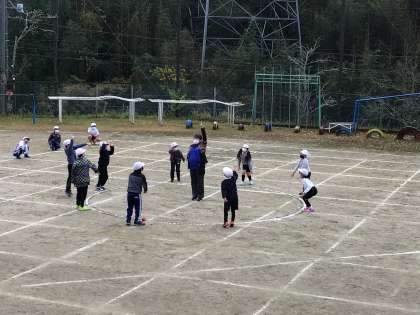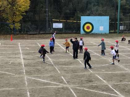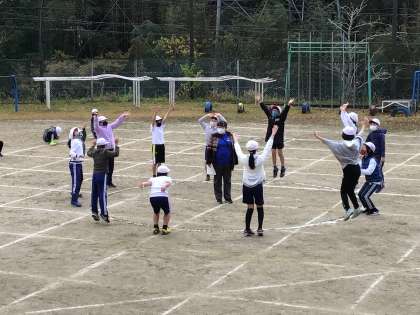 本番前の最後の玉入れの練習をしました。朝、雨が降って、地面が濡れていたので実際に玉を使わないで、エア玉入れをしました。