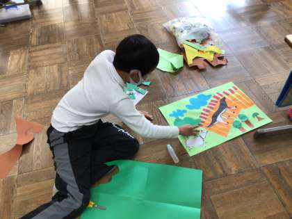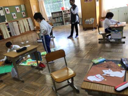 3年生の子供たちは、「あらしの夜に」の絵本で、読書感想画を描きました。切り貼りした画用紙が効果的で、迫力のある絵に仕上がりました。みんな満足そう。