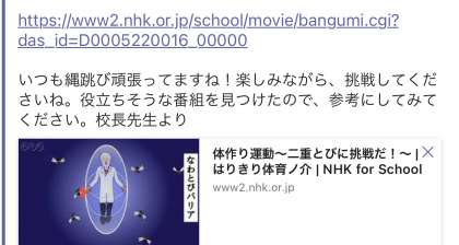 456年生の学習タブレットに送っています。時間のある時に、二重跳びの技の参考にしてみてください。https://www2.nhk.or.jp/school/movie/bangumi.cgi?das_id=D0005220016_00000