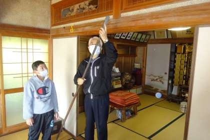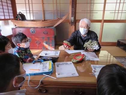 悪い人が来た時にはやりを使って追い払うことや、塩の道と言われ、岩倉から足助まで馬で運ぶことや、昔はわらぞうりをはいていたことなどを実物を見せながら教えてくださいました。子供たちは興味津々!