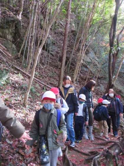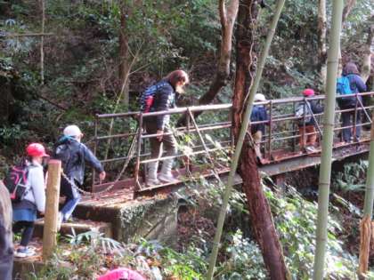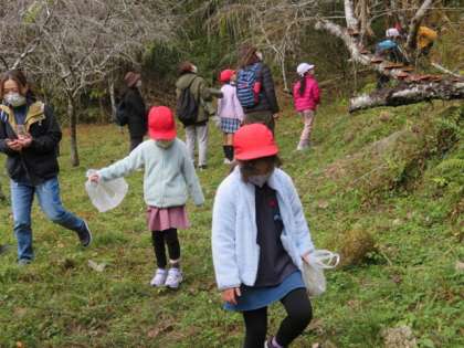 鎖を持ちながら、吊り橋も渡りました。1年生のみんなは、たくさんの木の実を拾いました。