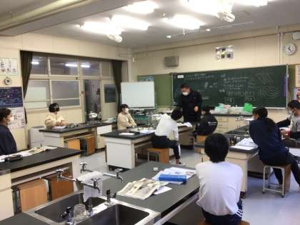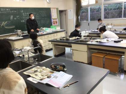 5年生の流れる水の働きからつながる、大地の成り立ちの学習です。子供たちは、石や化石を実際に手に取って観察しました。地層の長い時間を想像することは難しいですが、結びつけて考えられた時、感動します。