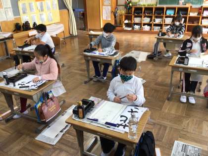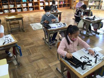 書き初めで書く「花さく里」の練習をしました。書写指導ボランティアの先生に教えていただいたことを思い出して、集中して練習しました。文鎮を置く音や手本を動かす音以外の音が無い、とても静かな教室です。