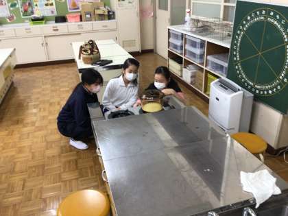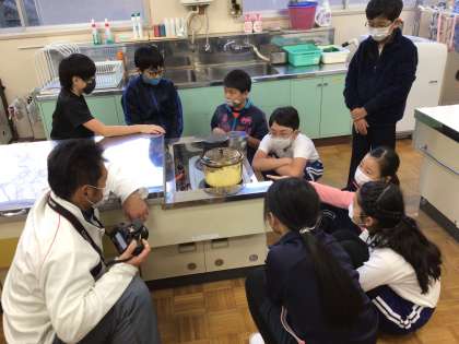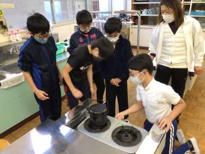 キャンプで飯盒炊飯を行う予定なので、家庭科の時間にご飯がどのように炊けるか、耐熱ガラスの鍋を使って確かめました。お米が炊き上がっていくのが見れて、とても不思議な感じがしました。