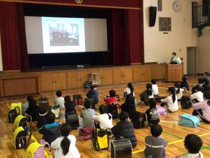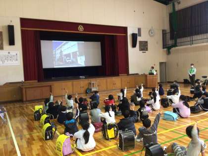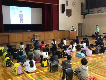 市役所から講師の方が3名来て、防犯教室を行ってくださいました。あやしい人の見分け方や防犯ブザーの点検などを行いました。