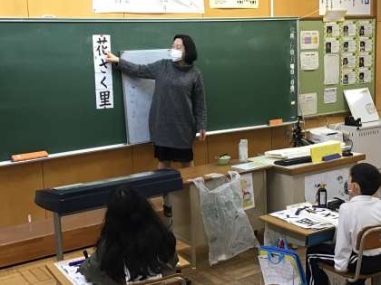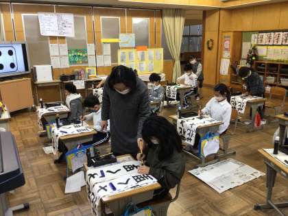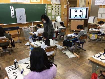書写指導ボランティアの先生から、書き初めで書く「花さく里」のポイントを教えていただきました。一字一字、丁寧に書きました。