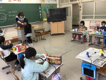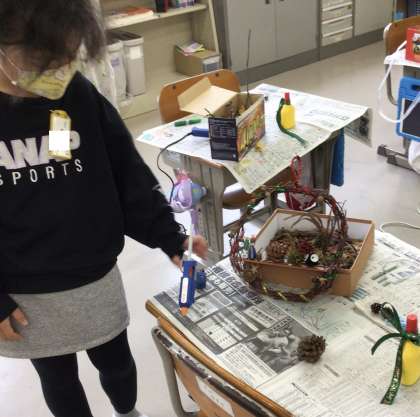 1年生は、秋のふるさとウオークで見つけてきた木の実や葉っぱを使って、オリジナルのとってもかわいいリースを作成中でした。センスがいいです。楽しむ様子が教室中から伝わりました。どの子も机の上に、マイ材料ボックスがありました。